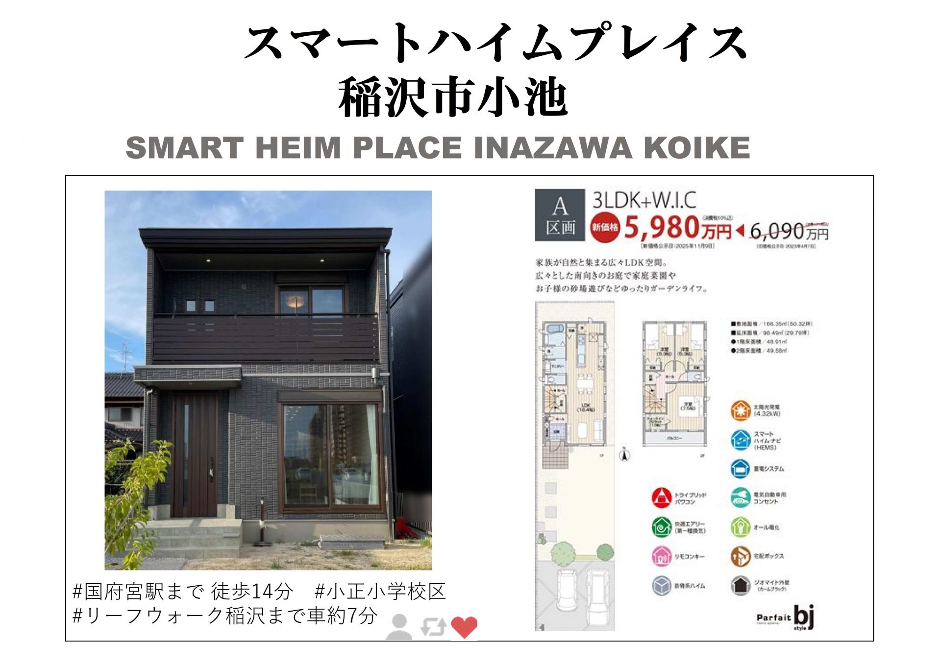 セキスイハイムの「創エネ・省エネ・蓄エネ」を備えたスマートな暮らし 家族の笑顔があふれる、陽だまりの住まい♪ 快適で安心、未来基準のスマート設備 ・【創エネ】太陽光発電システム 屋根いっぱいに太陽光パネルを搭載し、自宅で電力を創り出すことで光熱費を大幅にカット! ・【省エネ】スマートハイムナビ 家じゅうの電力使用状況が「見える化」され、無駄のない省エネライフをサポート。 ・【蓄エネ】蓄電池 災害時や停電時でも最低限の生活電力を確保。いざという時にも安心です。 暮らしやすさとデザイン性を両立したLDK ・約20帖の広々LDK+Jスペース付き! 南向きの大開口から陽ざしが差し込む明るい空間。 家族の会話が自然と生まれる、キッチンと一体になった設計です。 ・コーナー開口×ソファ×庭の眺め くつろぎながら外の景色を楽しめる、こだわりのリビング演出。 ・Jスペースは子どもの遊び場やお昼寝に◎ リビングに隣接した多目的スペースは、育児中の方にも嬉しいポイント。 ・パントリー付きオープンキッチン 作業効率がアップする収納力と開放感。落ち着いたカラーでどんなインテリアにも馴染みます。 ・人工芝付きの庭 プール遊び、BBQ、ガーデニングなど、家族で楽しめるプライベート空間も♪ 教育・医療・買い物・公園が徒歩圏内の充実環境! 春日小・中学校や保育園が徒歩圏内で、子育てに安心の立地。 徒歩6〜14分圏内にコンビニ・スーパー・ドラッグストアもそろい、日常の買い物にも便利です。 クリニックや図書館、公園も近く、暮らしやすさが整った住環境です。 こんな方におすすめ 子育て環境を重視したいご家族 通園・通学や買い物に便利な立地がいい 医療施設や公園が近くにある安心感が欲しい おすすめポイントまとめ 太陽光発電+蓄電池で経済的&災害にも強い 開放感あるLDK+多目的Jスペース 駅・学校・スーパー・医療施設が徒歩圏内 子育てファミリーに優しい住環境 スマートハイムプレイス稲沢市小池
