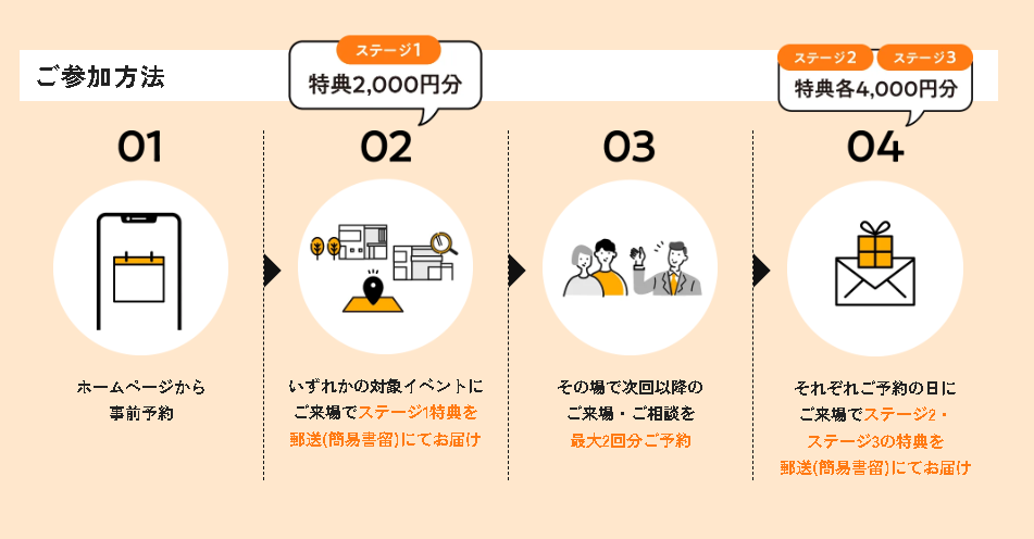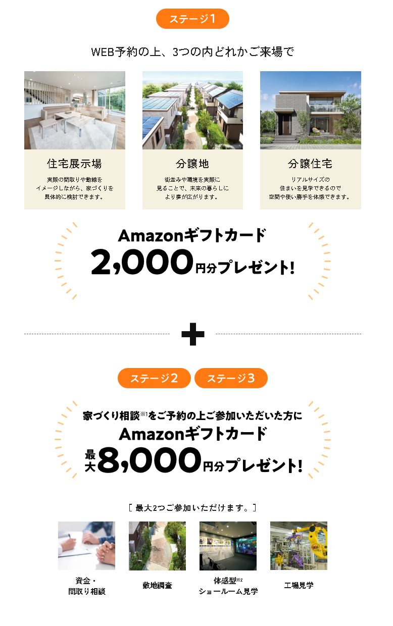 ※1 対象は①資金・間取り相談、②敷地調査、③体感型ショールーム見学、④工場見学となります。これらの内1つ実施で4,000円、最大で2つ実施で8,000円分を郵送(簡易書留)にてプレゼント致します。ステージ2・ステージ3につきましてはホームページからのご予約は対象外となります。ご予約方法は営業担当にお尋ねください。