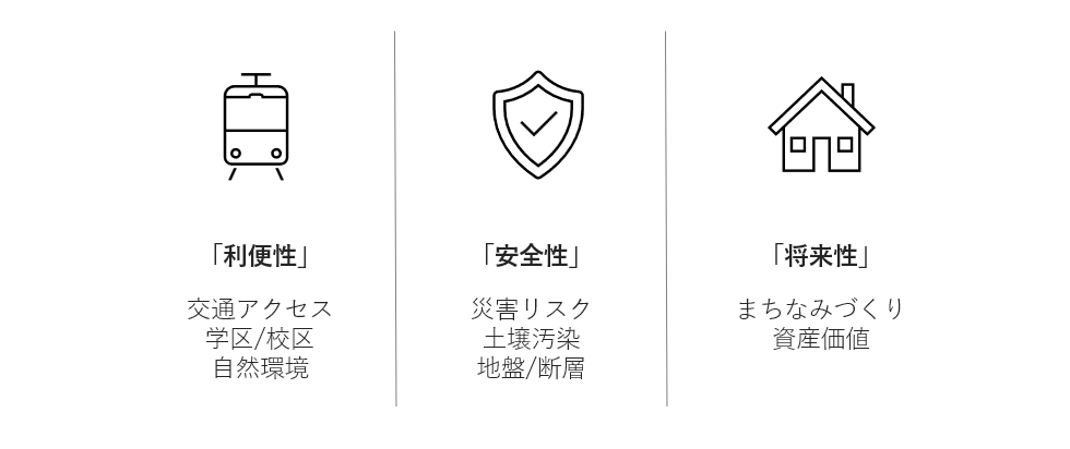災害リスク、地盤・断層調査、土壌汚染リスクなどの「安全性」、