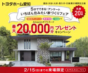 ■内容/フェア対象者に、Amazonギフトカードを最大20,000円分プレゼントします。【実施期間/2026年1月31日(土)~2月15日(日)】WEBアンケートに回答いただいた先着20名さまに500円分のAmazonギフトカードをプレゼント、【来場期間/2026年1月31日(土)~2月15日(日)】アンケートに回答のうえトヨタホーム愛知の対象展示場に予約後、見学いただいた先着20名さまに20,000円分のAmazonギフトカードをプレゼントします。
