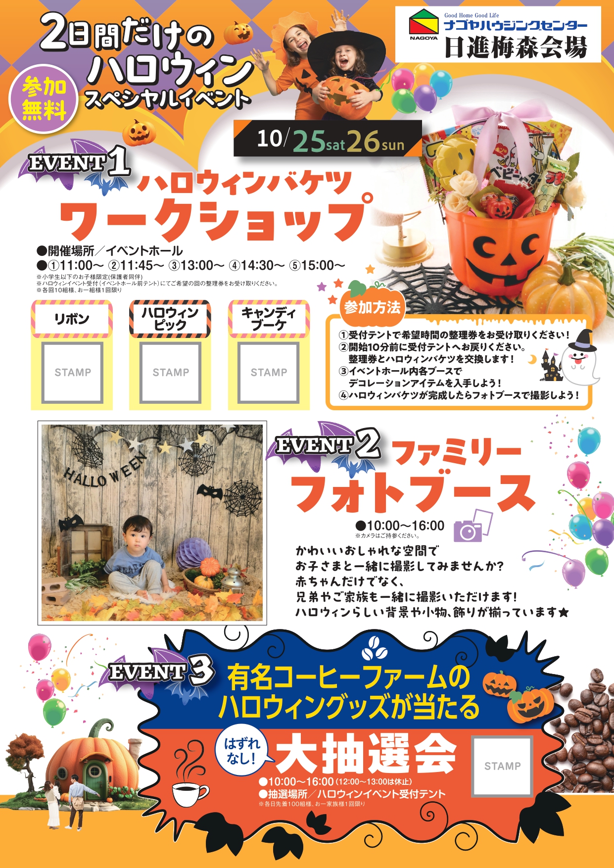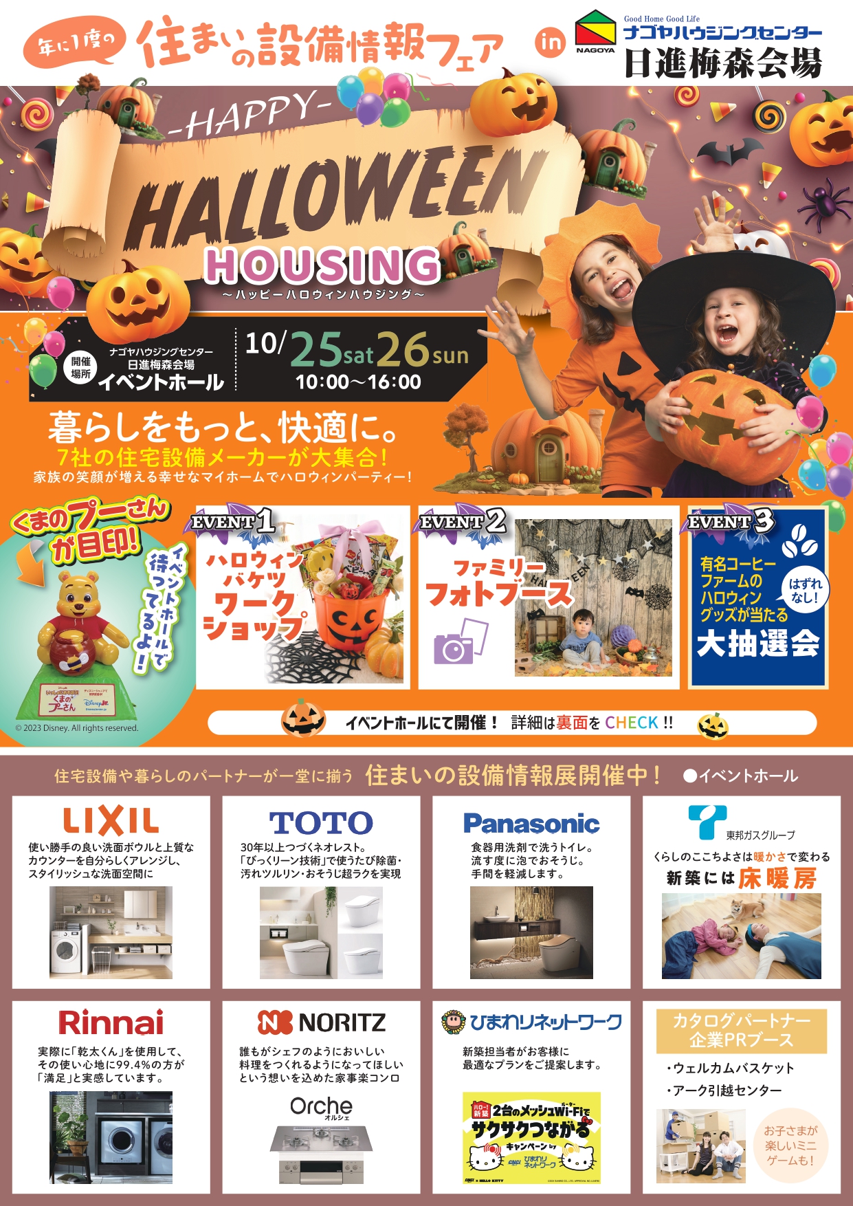 2025.09.26(金) 日進梅森会場 住まいの設備情報フェア ~ハッピーハロウィンハウジング!~ ■東邦ガスライフソリューションズ ■LIXIL ■TOTO ■パナソニックリビング ■Rinnai ■ノーリツ ■ひまわりネットワーク 7社による合同イベント! 2025年10月25日(土)&26日(日)2日間限定開催!! ハロウィンバケツのワークショップを楽しみながら住まいの最新設備を体感いただけます♪ 有名コーヒーファームのハロウィングッズが当たる抽選会も同時開催! 前の記事 次の記事 一覧へもどる